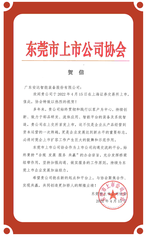 感謝東莞市上市公司協會對安達智能上市儀式的祝福。